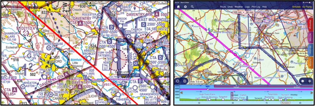 Having left the LLR you will probably want to climb from the low level that you have been flying at for the 12NN length of the route. The threat here is that the Manchester CTA immediately south of the LLR has a base of just 2,500 feet and it won’t take long for most aircraft to reach that level. Make sure that you have a plan that will keep you below the CTA with a margin for error. So, in this case using the “Take 2” methodology, set an initial climb limit of 2,300 feet. Having flown past Crewe, the lowest limit of controlled airspace for the rest of the way to Sywell is 4,500 feet (the Daventry CTA which overlays Stoke-on-Trent – Figure 3) so, given usual cruising levels, vertical infringement shouldn’t be an issue. However, do make sure that you have noted an upper limit for your flight, say 4,300 feet on your PLOG just in case you get tempted to fly higher at some point. It is not uncommon for pilots to miss some of the annotations on the chart in-flight, particularly if it is turbulent or if there are other things to do such as FREDA checks that draw your attention away from navigation. To make these details stand out more to you in flight, you may consider highlighting them; again, a good application of TEM.