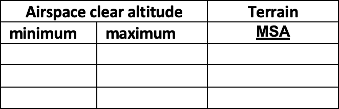 Having drawn a line, whether electronically or on the paper chart, you should check for any airspace above or below your route. In ‘Taking 2’, plan for maximum ‘airspace clear altitude’ (the lower limit of vertical controlled airspace less 200 feet if possible) for each leg alongside minimum airspace clear altitude; perhaps annotate this alongside the MSA calculation: